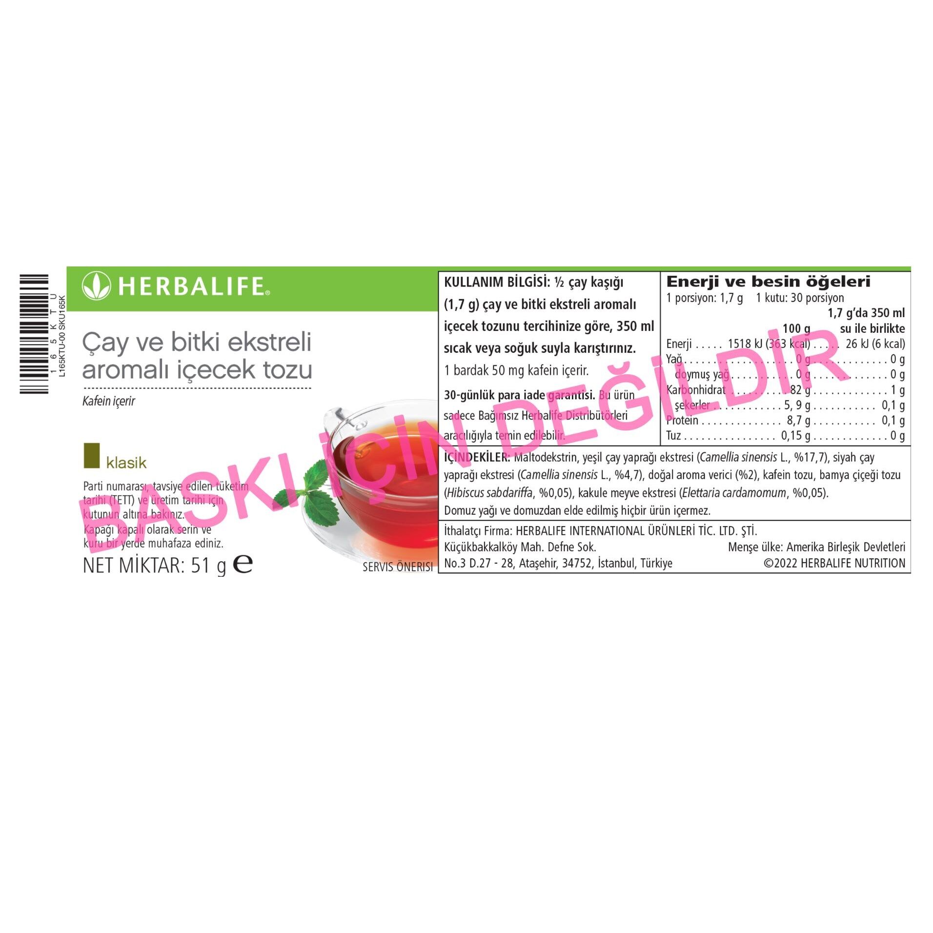Herbalife Çay ve Bitki Ekstreli Aromalı İçecek Tozu-Klasik 51 gram