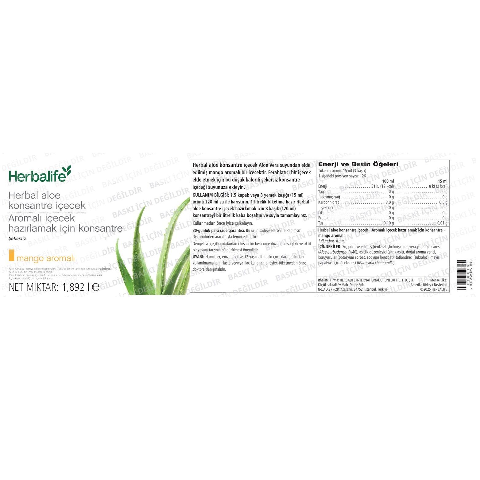 Herbalife Herbal Aloe Konsantre İçecek Mango Aromalı 1,892 litre