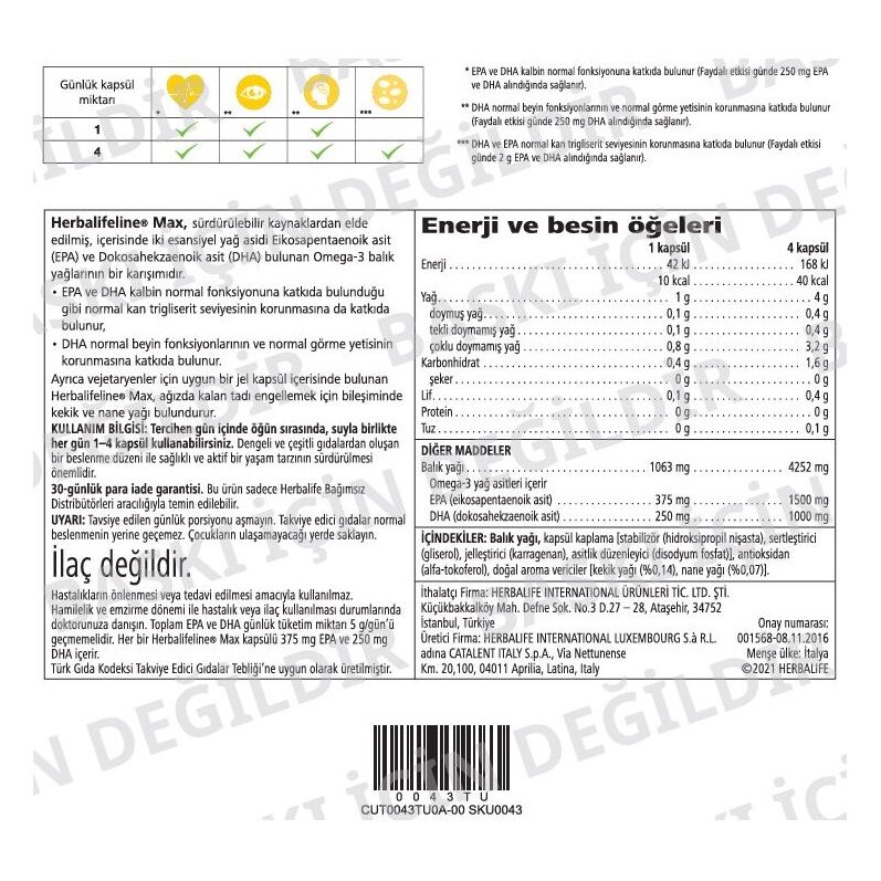 Herbalifeline® Max'in her bir kapsülü 375 mg EPA ve 250 mg DHA sağlar. Bu temel yağ asitleri kalbin normal fonksiyonuna, normal kan basıncının korunmasına ve normal kan trigliserit seviyelerinin korunmasına katkıda bulunur. DHA ayrıca normal beyin fonksiyonlarının ve normal görüşün korunmasına katkıda bulunur.**