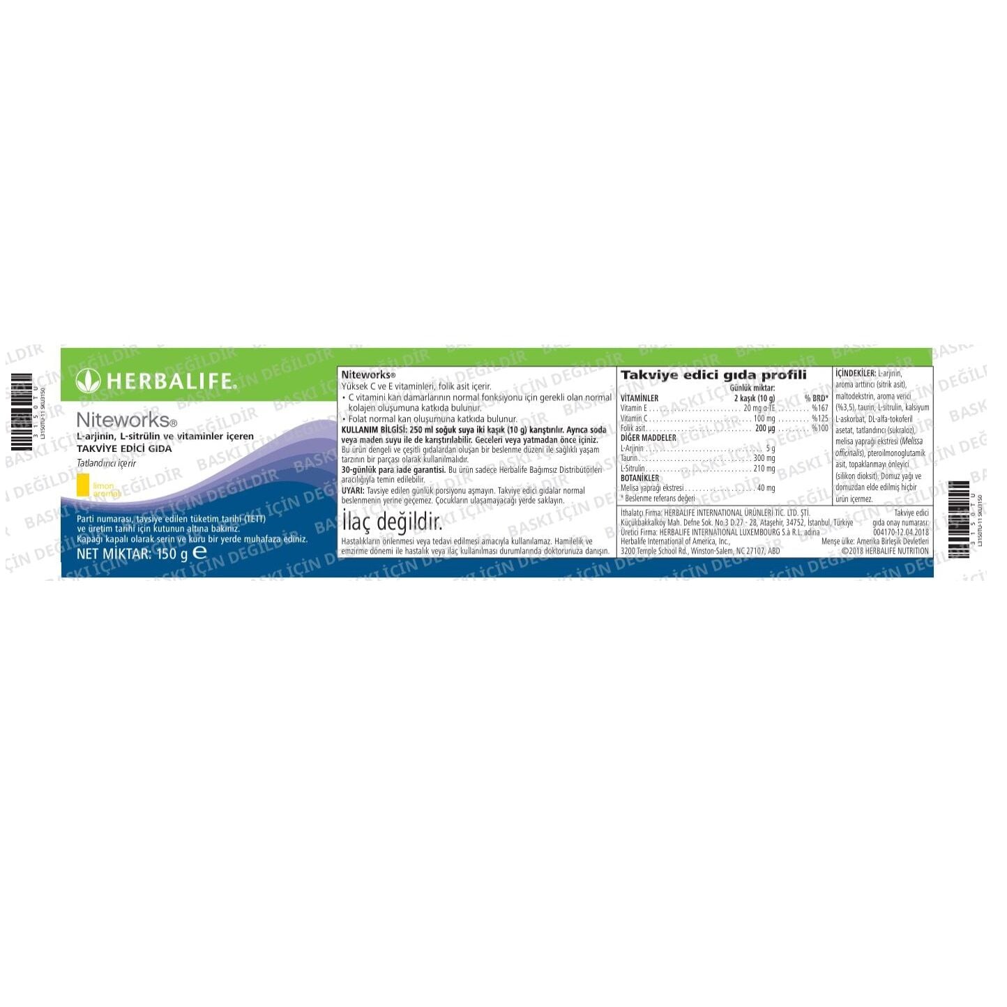 Herbalife Niteworks L-arjinin, L-sitrülin ve Vitaminler İçeren Takviye Edici Gıda-Limon Aromalı 150 gram