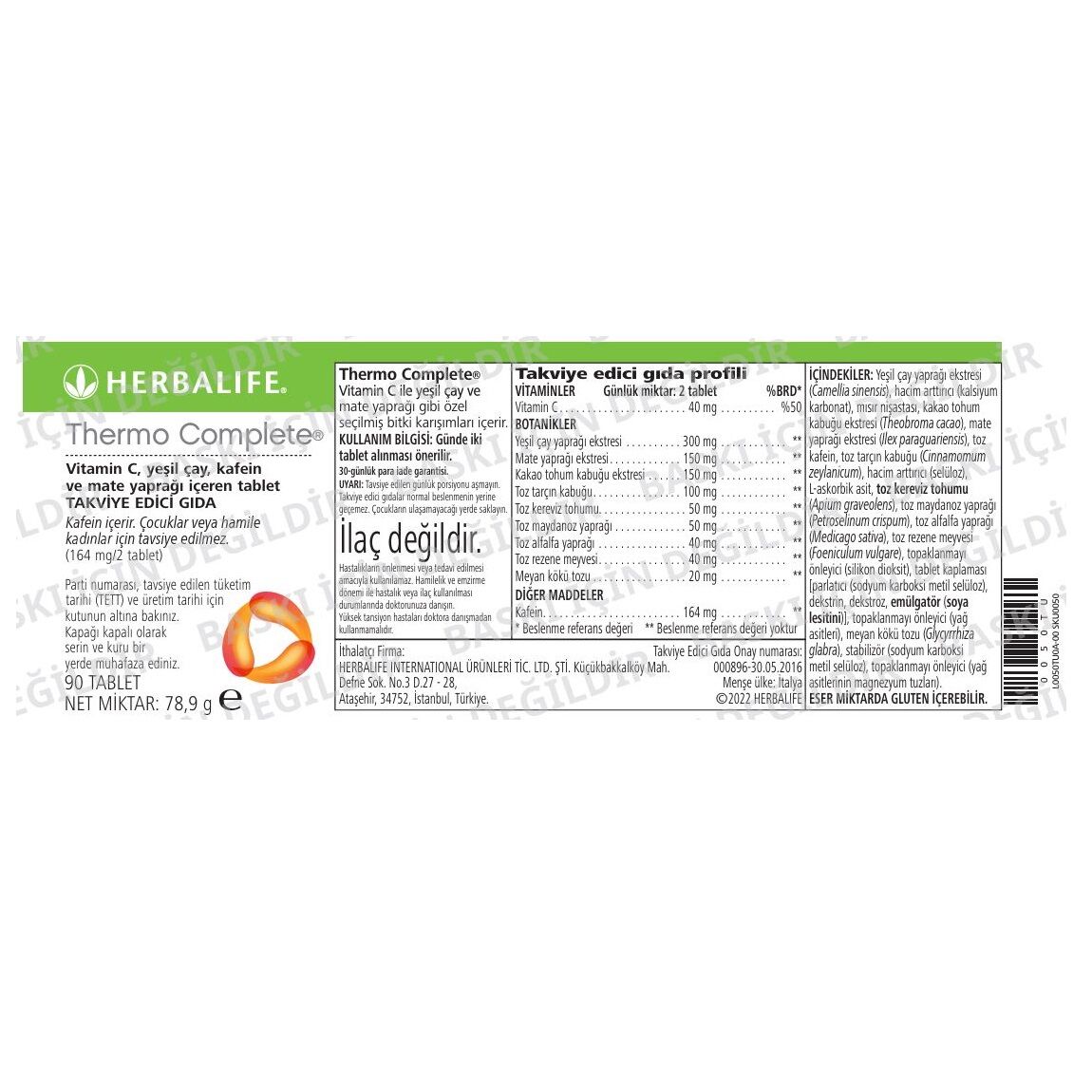 Yeşil çay yaprağı ekstresi (Camellia sinensis), hacim arttırıcı (kalsiyum karbonat), mısır nişastası, kakao tohum kabuğu ekstresi (Theobroma cacao), mate yaprağı ekstresi (Ilex paraguariensis), toz kafein, toz tarçın kabuğu (Cinnamomum zeylanicum), hacim arttırıcı (selüloz), L-askorbik asit, toz kereviz tohumu (Apium graveolens), toz maydanoz yaprağı (Petroselinum crispum), toz alfalfa yaprağı (Medicago sativa), toz rezene meyvesi (Foeniculum vulgare), topaklanmayı önleyici (silikon dioksit), tablet kaplaması [parlatıcı (sodium karboksi metil selüloz), dekstrin, dekstroz, emülgatör (soya lesitini)], topaklanmayı önleyici (yağ asitleri), meyan kökü tozu (Glycyrrhiza glabra), stabilizör (sodyum karboksi metil selüloz), topaklanmayı önleyici (yağ asitlerinin magnezyum tuzları).